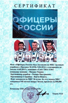 В музей был передан и сертификат ЦПК, врученный Петру Майданову командиром ТПК «Союз-14М» летчиком-космонавтом, Героем Российской Федерации полковником Александром Самокутяевым и свидетельствующий о том, что флаг действительно был доставлен на МКС грузовым кораблем «Прогресс М-23М» 9 апреля 2014 года и возвращен на Землю экипажем «Союза ТМА-11М» 14 мая (на флаге автографы экипажа Михаила Тюрина, Ричарда Мастраккио и Коичи Ваката), пробыв на МКС 36 суток, совершив 548 витков вокруг Земли и пролетев 22 500 тыс. километров.