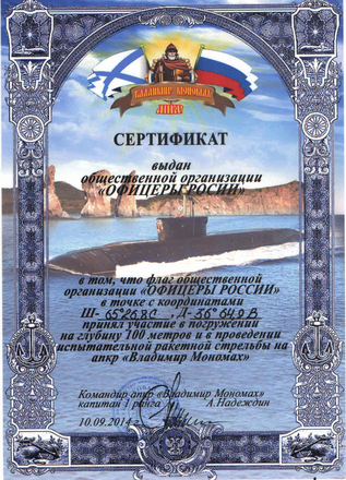 Команда атомного подводного крейсера подготовила для флага организации «ОФИЦЕРЫ РОССИИ» еще одно испытание – он был погружен на глубину 100 метров. Согласно военно-морской традиции – зафиксированы координаты места погружения: Ш – 6526,8С, Д – 3664,9В. По результатам погружения – выдан сертификат.