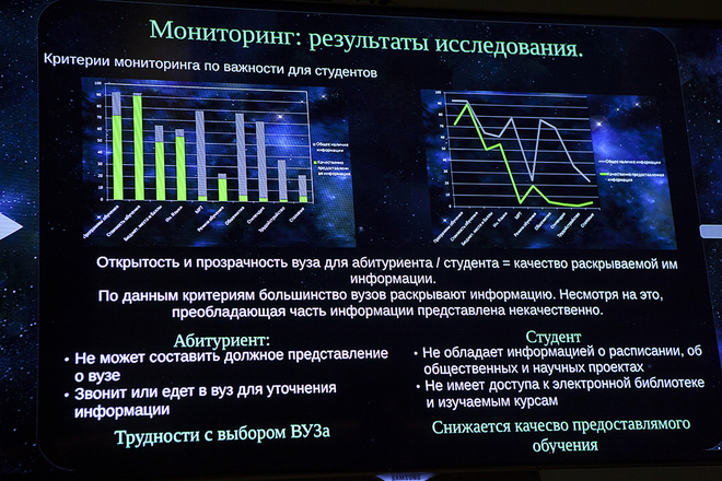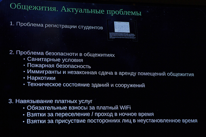 Дискуссия развернулась по многим вопросам. В частности, собравшиеся обсудили участие общественных объединений студентов в противодействии коррупции и правонарушениям в образовательной среде, правовую поддержку студенчества по вопросам качества получения образовательных услуг, информационную доступность российских вузов, рейтинг открытости вузов Москвы и Санкт-Петербурга. Отдельно была затронута проблема безопасности студенческих общежитий, способы оперативного реагирования на нарушения, формирование оперативных выездных групп и другое.