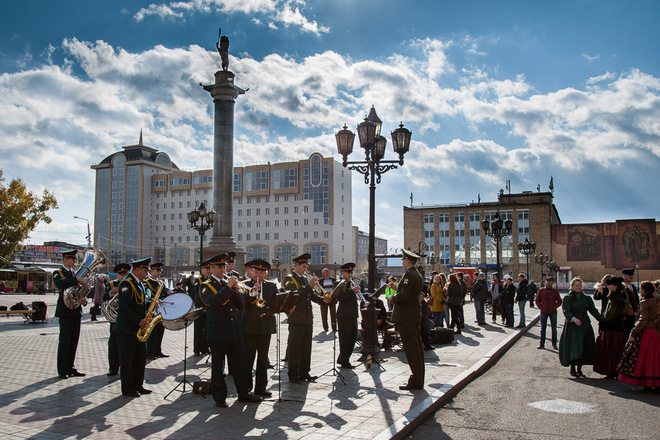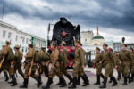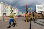 Участники реконструкции, переодетые в форму солдат и офицеров 8-й Сибирской стрелковой дивизии, прошли маршем от площади Революции (Новобазарной) по местам, где находились полковая церковь 30-го Сибирского стрелкового полка, казармы полка, по Красной площади, которая носила название Плац – Парадной. На Красной площади они остановились у здания, где находился штаб полка, и продолжили путь до здания железнодорожного вокзала Красноярска.