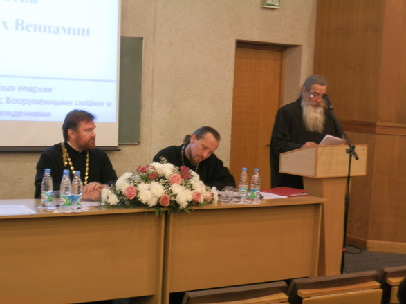 В своем докладе он обратил внимание на особенность современной ситуации и необходимость постоянной работы по воспитанию патриотических чувств у подрастающего поколения, гражданского самосознания. Особое место было уделено необходимости согласованности действий Церкви и Вооруженных сил в деле духовно-нравственного воспитания будущих защитников Отечества.
