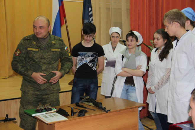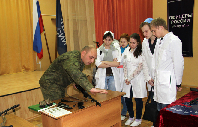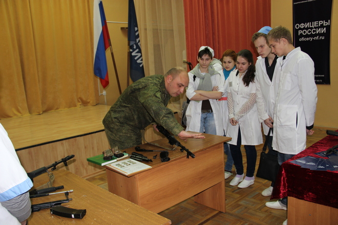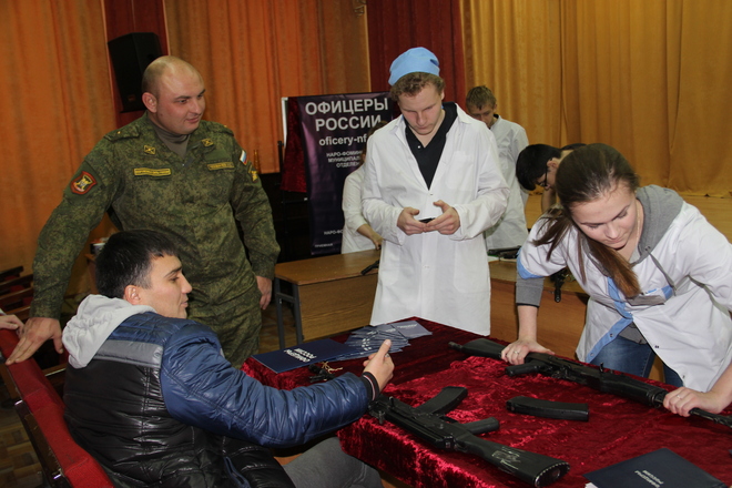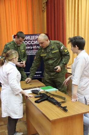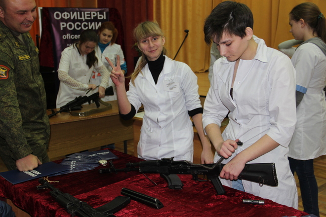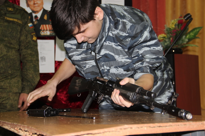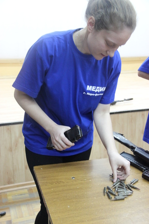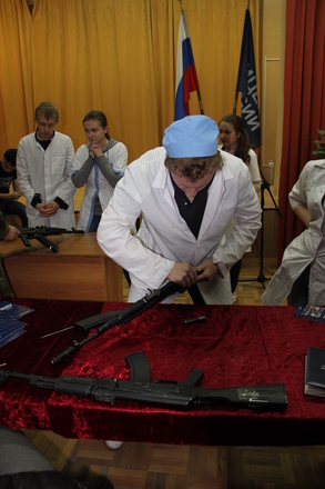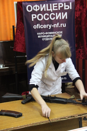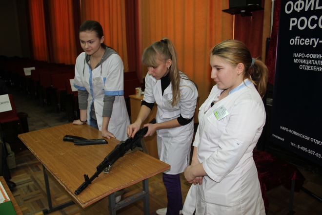 Члены Президиума Наро-Фоминского отделения «ОФИЦЕРОВ РОССИИ» Маргарита Зеленская, Заза Засеев, Андрей Ковалев и руководитель исполкома Дмитрий Овсянников провели в Наро-Фоминском медицинском училище соревнования по разборке – сборке автомата Калашникова, посвященные 95-летию со дня рождения его создателя, выдающегося оружейника Михаила Тимофеевича Калашникова.