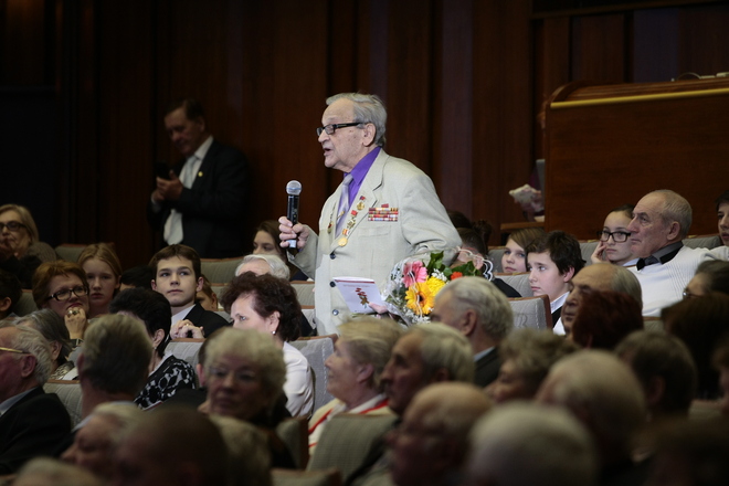 Гости делились с молодежью воспоминаниями о Великой Отечественной войне, рассказывали о своих боевых товарищах. Во время этого их фронтовые фотографии демонстрировались на экранах, установленных в зале.
