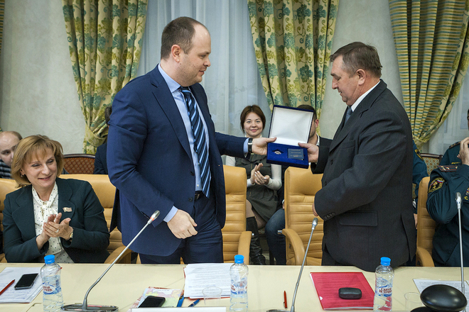 В ходе заседания Антон Цветков вручил орден «За офицерскую честь» начальнику ГУ МЧС России по г. Москве генерал-полковнику внутренней службы Александру Елисееву.