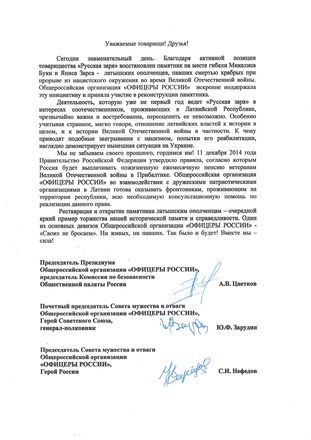 «Реставрация и открытие памятника латышским ополченцам – очередной яркий пример торжества нашей исторической памяти и справедливости. Один из основных девизов нашей организации – «Своих не бросаем!» Ни живых, ни павших. Так были и будет! Вместе мы – сила».