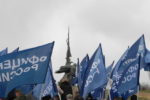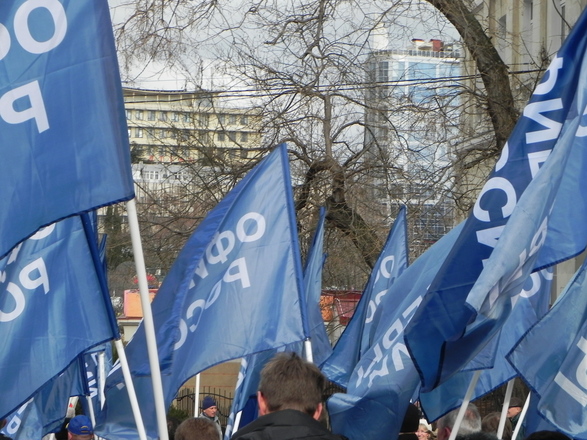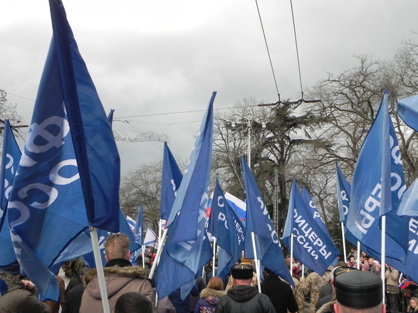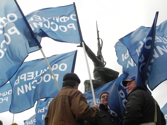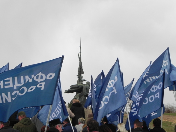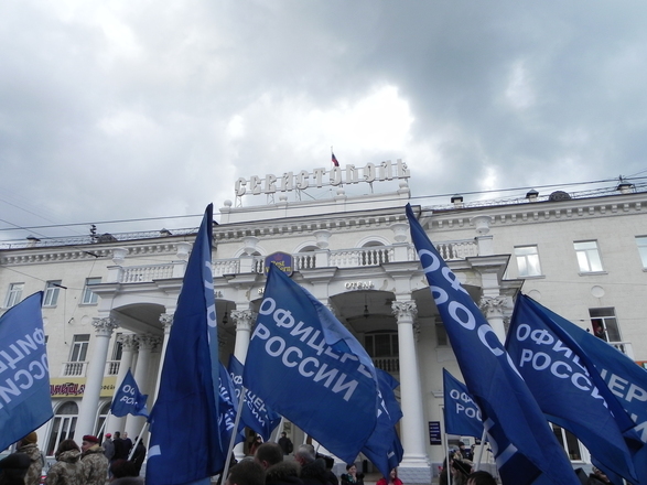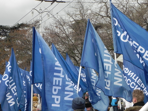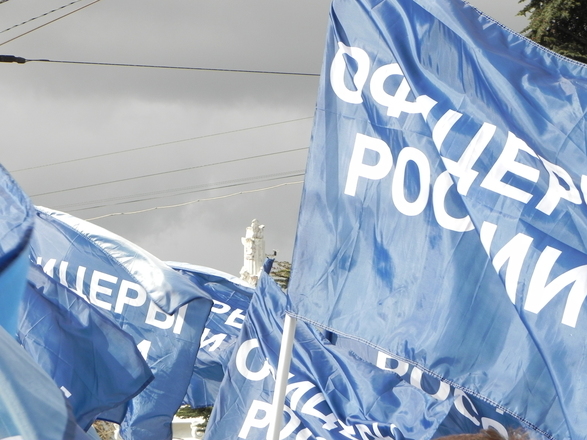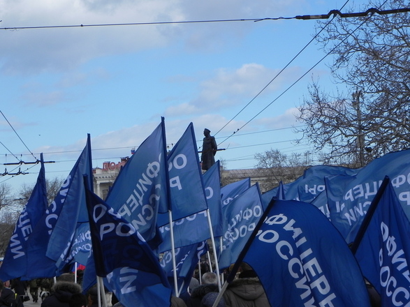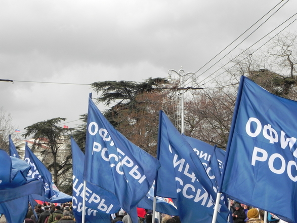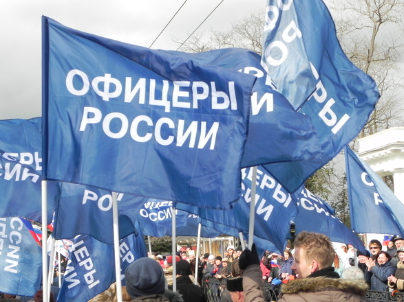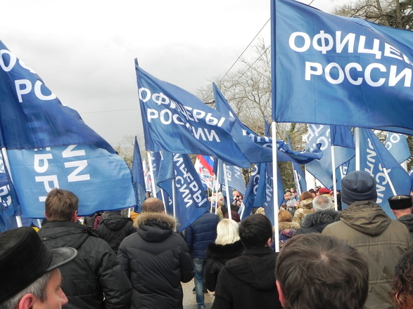 Колонна регионального отделения «ОФИЦЕРОВ РОССИИ» Севастополя насчитывала около 100 человек. Небесно-синее море флагов полоскалось на фоне пасмурного севастопольского моря. Настроение у всех было праздничное и боевое.