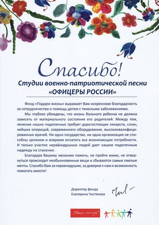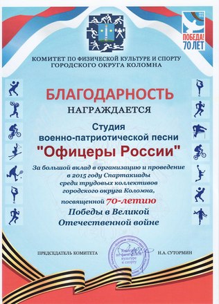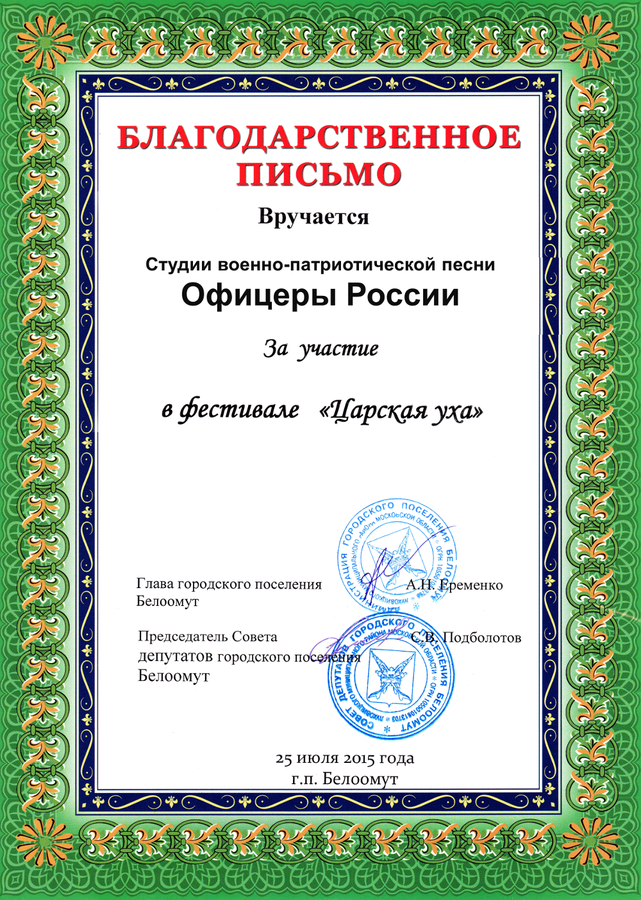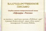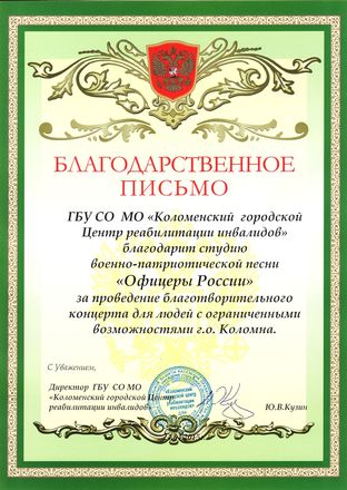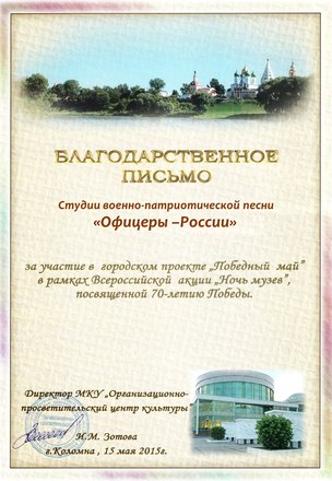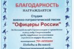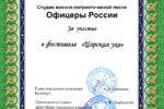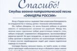 За активную деятельность по популяризации истории российского воинства и патриотической песни Студия военно-патриотической песни «ОФИЦЕРЫ РОССИИ» не раз удостаивалась благодарностей от администраций городских и сельских округов Московской области.