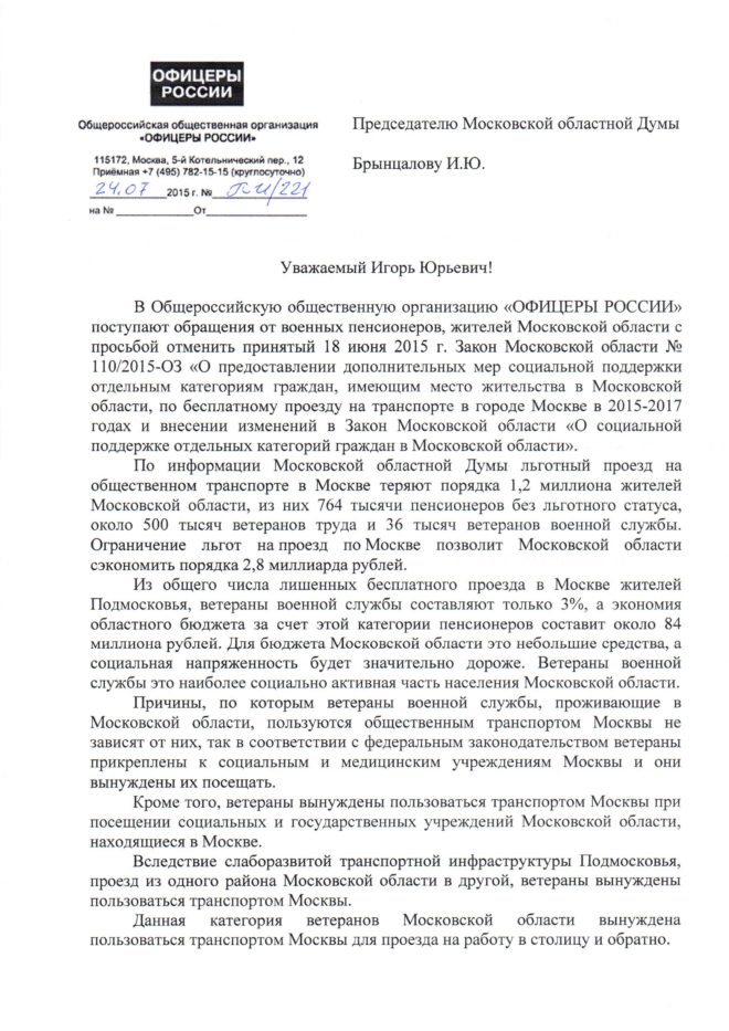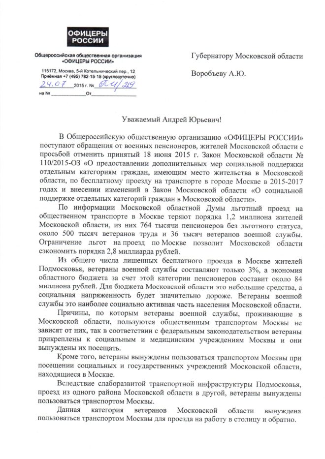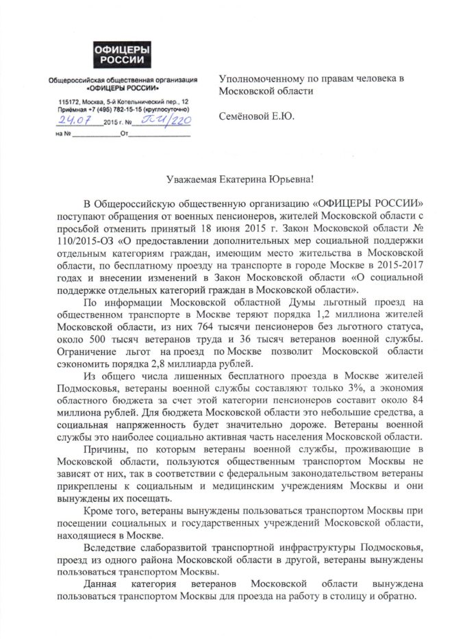 «В Общероссийскую организацию «ОФИЦЕРЫ РОССИИ» поступают обращения от военных пенсионеров – жителей Московской области – с просьбой отменить принятый 18 июня 2015 г. Закон Московской области № 110/2015-ОЗ «О предоставлении дополнительных мер социальной поддержки отдельным категориям граждан, имеющим место жительства в Московской области, по бесплатному проезду на транспорте в городе Москве в 2015-2017 годах и внесении изменений в Закон Московской области «О социальной поддержке отдельных категорий граждан в Московской области», – говорится в обращении.