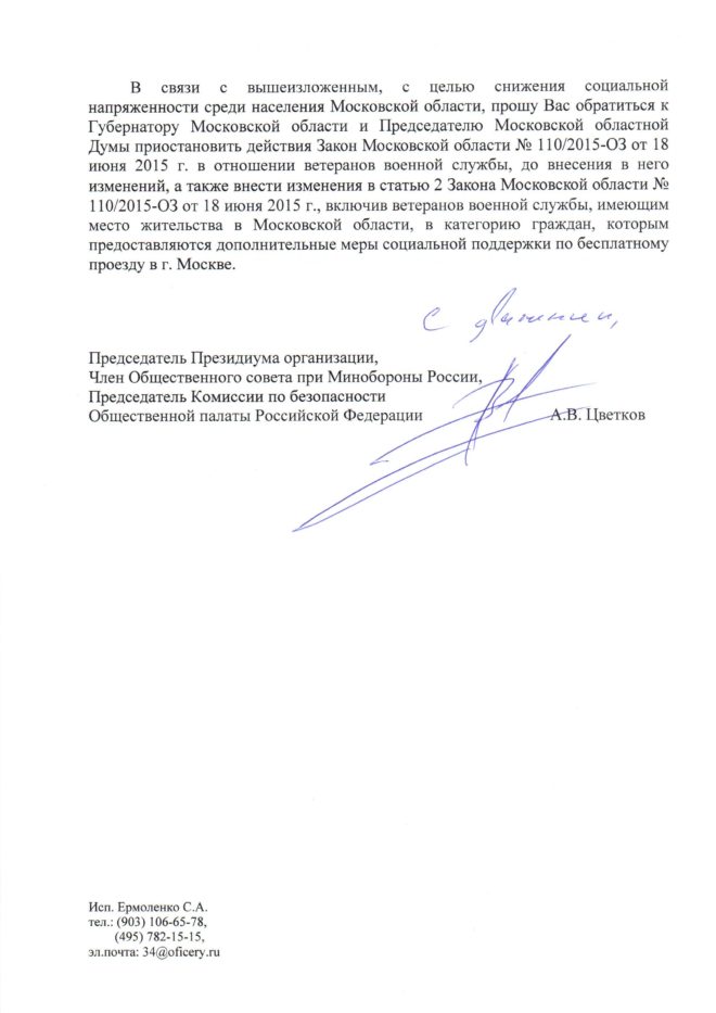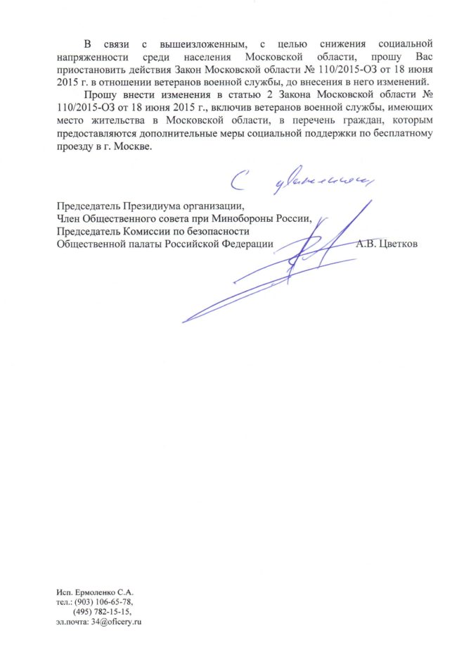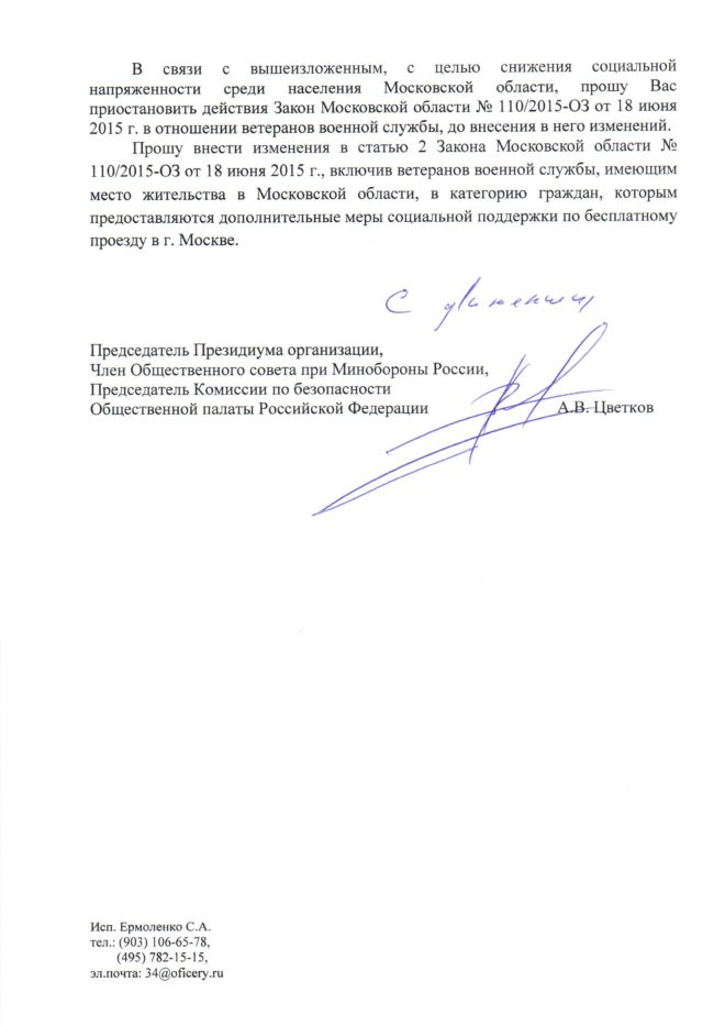 В связи с вышеизложенным председатель Президиума «ОФИЦЕРОВ РОССИИ» Антон Цветков просит приостановить действие Закона Московской области № 110/2015-ОЗ от 18 июня 2015 г. в отношении ветеранов военной службы, до внесения в него изменений.