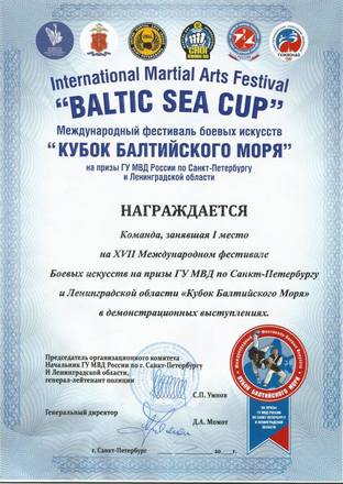 Команда, в которую входили представители регионального отделения «ОФИЦЕРОВ РОССИИ» Санкт-Петербурга, заняла первое место на ХVII Международном фестивале боевых искусств «Кубок Балтийского моря-2015» в конкурсе показательных выступлений. В соревнованиях приняли участие 15 команд.