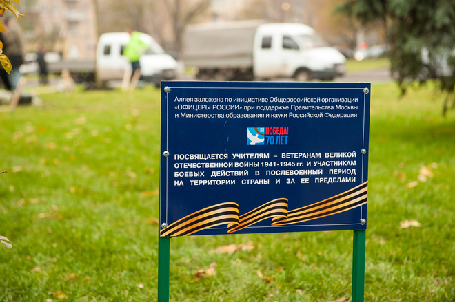 24 октября по инициативе Общероссийской организации «ОФИЦЕРЫ РОССИИ» в сквере на улице Павла Андреева в Москве состоялась торжественная церемония закладки аллеи, посвященной учителям-ветеранам Великой Отечественной войны 1941-1945 годов, а также учителям, являющимся участниками боевых действий в послевоенный период – Афганистан, Северо-Кавказский регион, локальные войны и военные конфликты на территории других государств. В год 70-летия Великой Победы появление в столице такой аллеи стало знаковым событием не только городского, но и федерального масштаба.