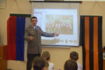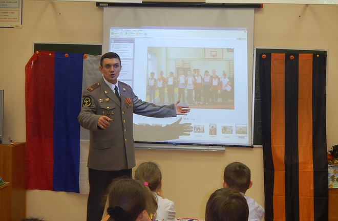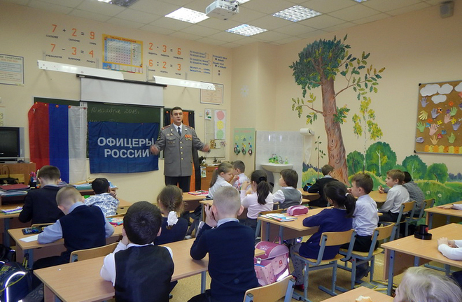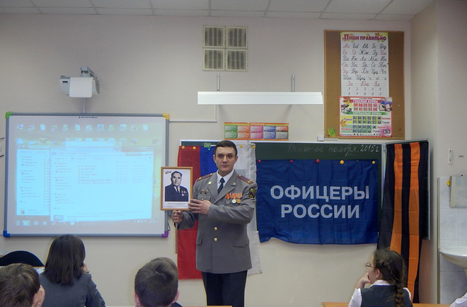 Перед школьниками выступил активист регионального отделения «ОФИЦЕРОВ РОССИИ» Московской области подполковник милиции в отставке Станислав Шамков. Он рассказал о смысле патриотизма и преемственности поколений, о ветеранах МВД – защитниках Москвы, принимавших участие в Параде 7 ноября 1941 года, и роли органов внутренних дел в защите и охране правопорядка.
