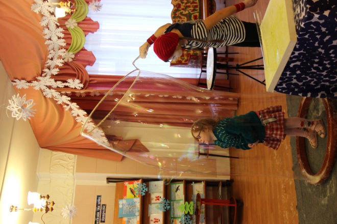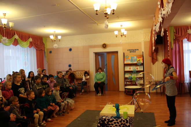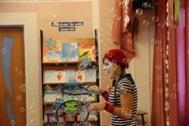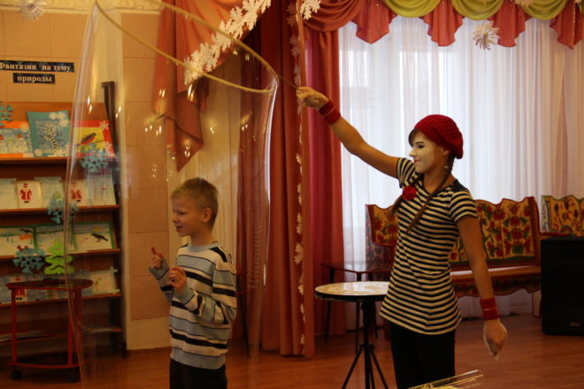 В гости к детишкам приехал сказочный мим – аниматор Анна Черкашина, которая привезла с собой необычные мыльные пузыри. Праздник был полон веселых игр, танцев и ярких эмоций. С восторгом ребята наблюдали, как в ловких руках мастера рождается настоящее мыльное чудо.