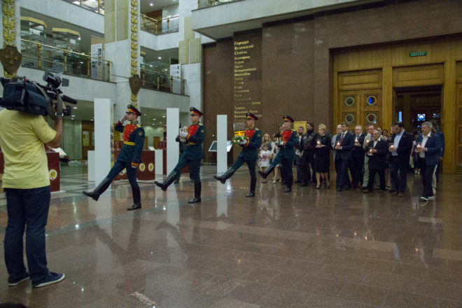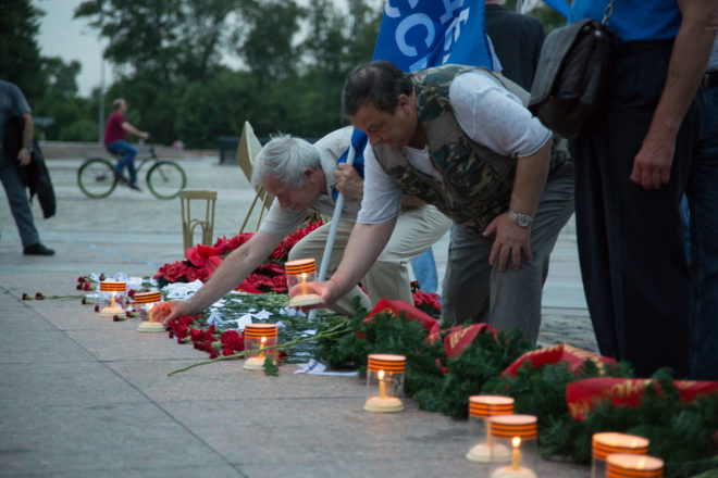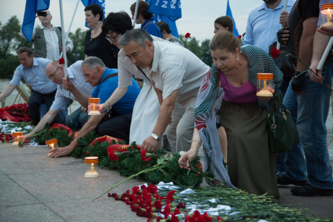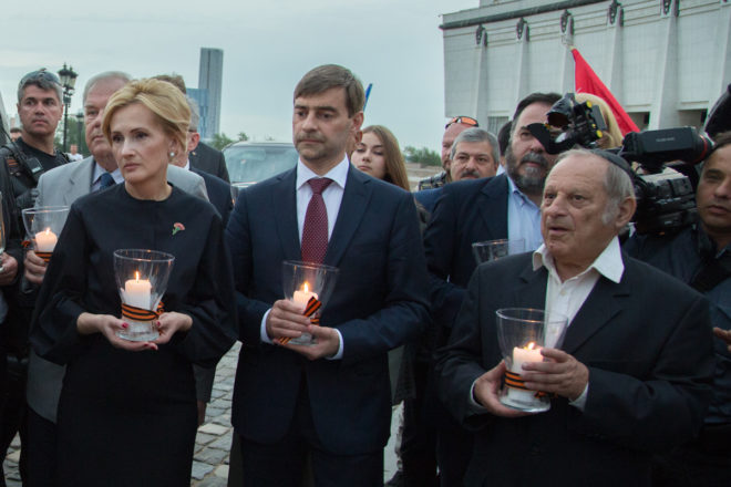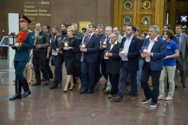 Вечером на Поклонной горе, где собрались депутаты Госдумы, представители общественных организаций, студенты, школьники, прошел митинг-концерт. Сюда же участники авто- и мотомарша доставили свечу памяти, которая была установлена в Зале памяти и скорби Центрального музея Великой Отечественной войны.