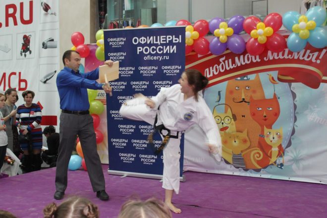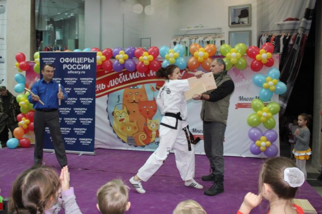 Ребята с большим удовольствием посмотрели показательные выступления по тхэквондо, которые провела руководитель отделения Оперативного молодежного отряда «ОФИЦЕРОВ РОССИИ», российская тхэквондистка, двукратная чемпионка мира, заслуженный мастер спорта России Светлана Метегина. Некоторые из ребятишек даже пытались повторять движения спортсменки.