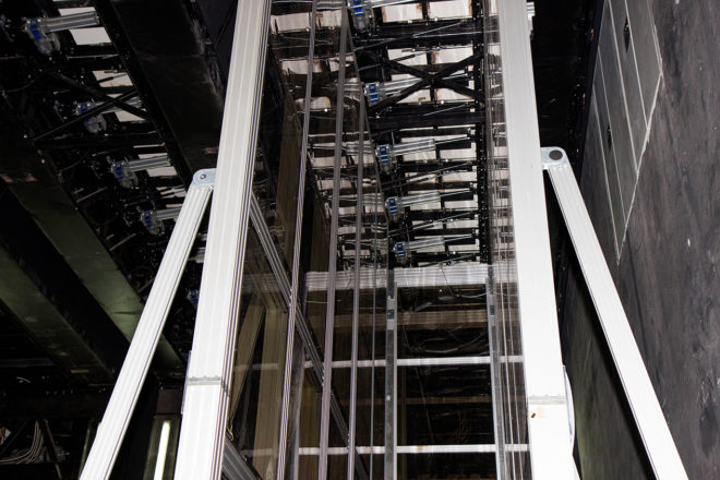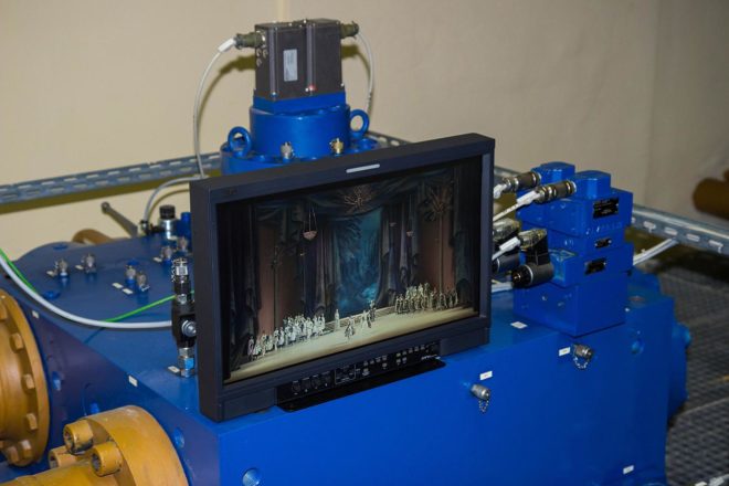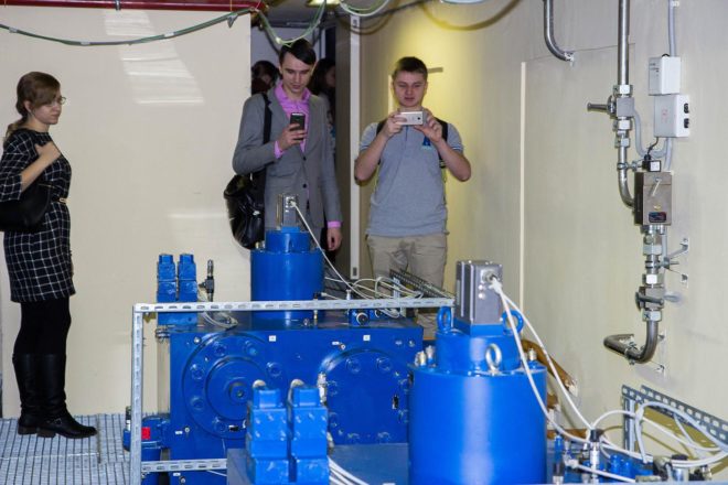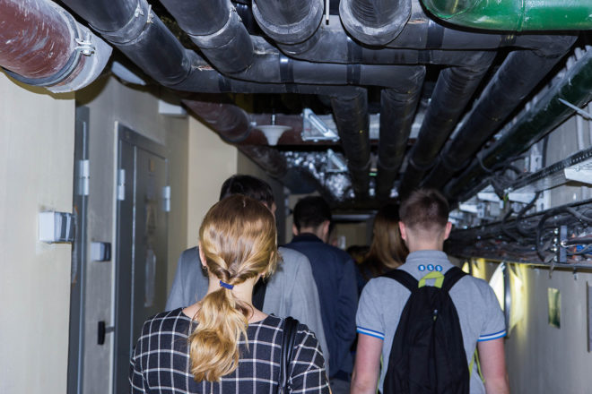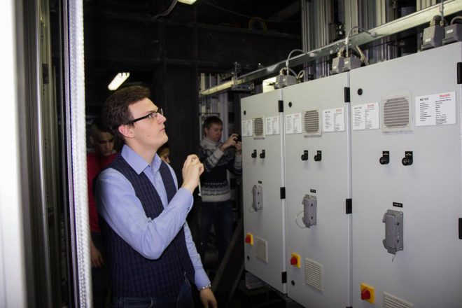От минус пятого этажа до десятого – комплекс технических сооружений Большого театра производит ошеломляющее впечатление. Ребята ознакомились с электромеханическим и гидравлическим оборудованием исторической сцены, побывали на арьерсцене – одной из важнейших технологических площадок театра, спускались в трюм сцены глубиной 17 метров. Молодые инженеры узнали, что над сценой расположено 100 индивидуальных и 78 штанкетных подъемов, каждый из которых может поднимать груз весом в одну тонну со скоростью 1,8 мс – таким образом, во время спектакля можно поднимать декорации, суммарный вес которых составляет 178 тонн. Для операций подъема используется уникальная лебедка, специально разработанная для Большого театра, а компьютеризированное управление верхней и нижней механизацией осуществляется с помощью пультов управления. Кстати, программное обеспечение разработано при участии инженеров – выпускников МАИ. С интересом ребята узнали о том, что Большой театр обладает одной из крупнейших подземных гидравлических станций в Москве, благодаря системе гидравлики сцена может опускаться и подниматься на 8 метров, а центральная часть оркестровой ямы способна опускаться вниз на 15 метров. Молодые инженеры даже не подозревали об истинном масштабе инженерных работ, необходимых для знаменитых на весь мир постановок Большого театра.