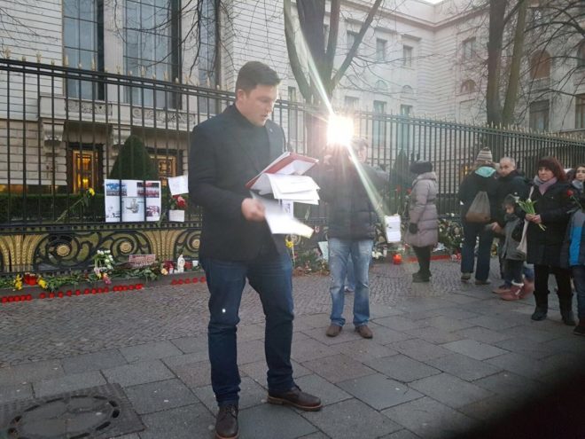В память о каждом из погибших участники акции зажгли свечу – 92 огонька засветились у посольства России на бульваре Унтер-ден-Линден.