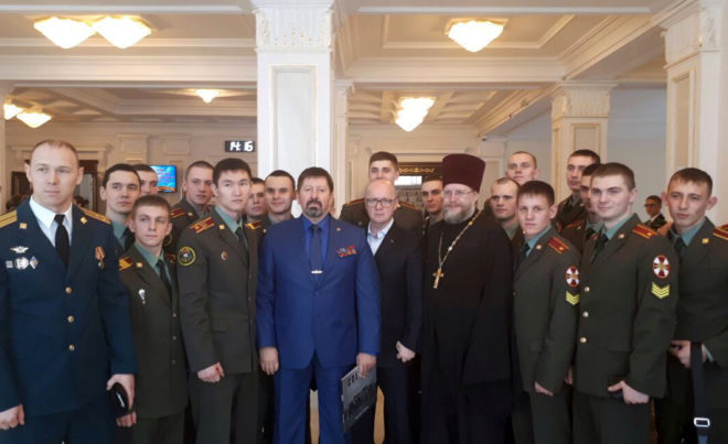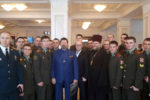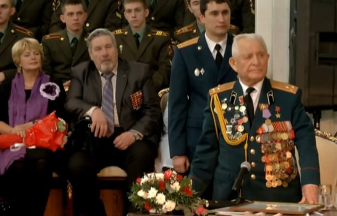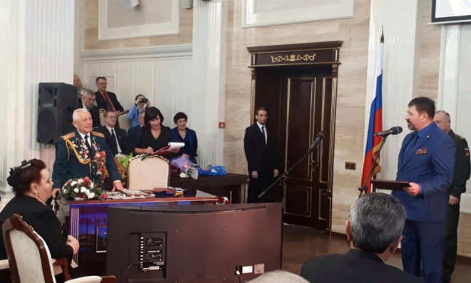 Поздравить фронтовика с юбилеем собрались Герои России, руководители областных и городских исполнительных органов государственной власти, командиры воинских частей, представители ветеранских организаций, учащиеся кадетских корпусов, учебных заведений.