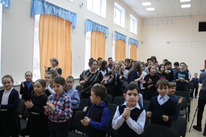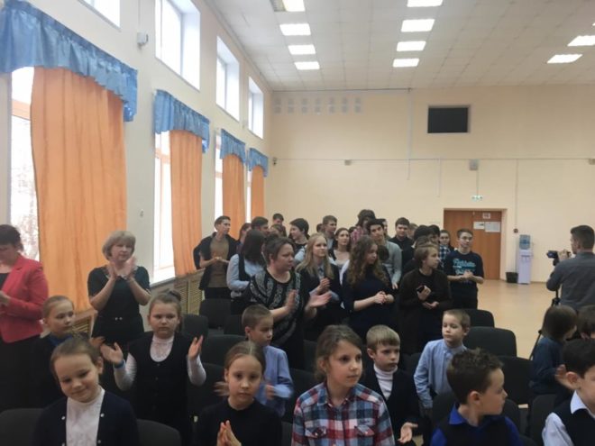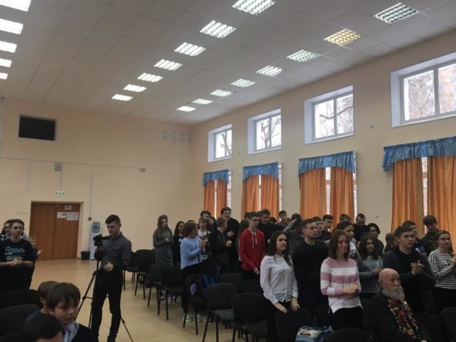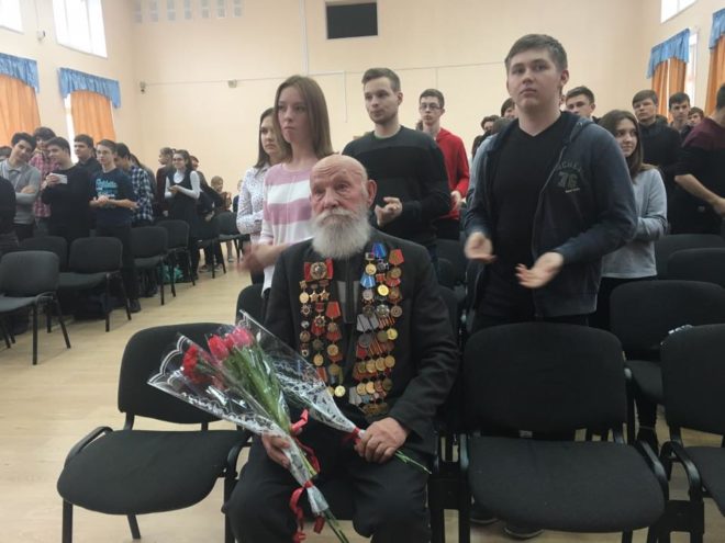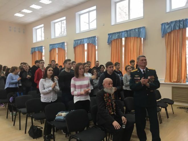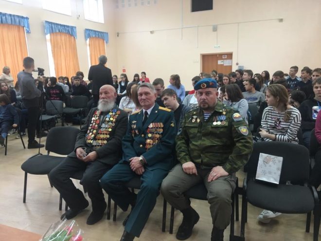 В гости к школьникам пришли ветеран Великой Отечественной войны, рядовой 4-й роты, 8-й Гвардейской стрелковой дивизии им. генерала И.В. Панфилова Владимир Бурцев; заместитель председателя Совета патриотических организаций «ОФИЦЕРОВ РОССИИ» полковник запаса Юрий Чмутин; руководитель исполнительного совета Комитета памяти героев подвига самопожертвования, член организации «ОФИЦЕРЫ РОССИИ» Сергей Звягин и ветеран боевых действий, офицер запаса ВДВ, автор и исполнитель песен Владимир Тальянов.