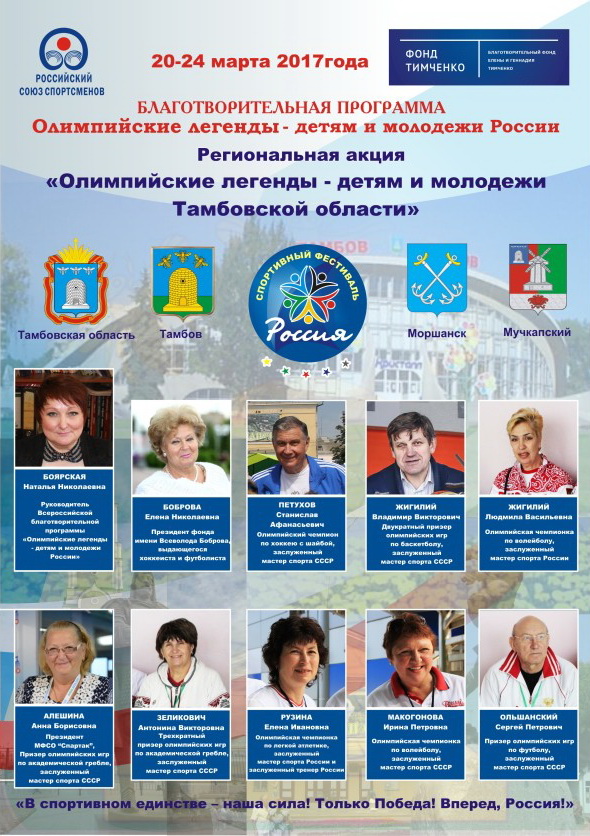22 марта в г. Моршанске прошла акция «Олимпийские легенды – детям и молодежи Тамбовской области». Она является частью спортивного фестиваля «РОССИЯ» в рамках масштабного проекта Всероссийской благотворительной программы «Олимпийские легенды – детям и молодежи России». Генеральный партнер программы – Благотворительный фонд Елены и Геннадия Тимченко.