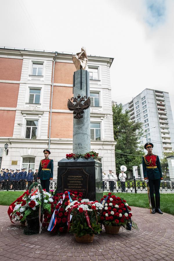 3 сентября, в День солидарности в борьбе с терроризмом, на территории Российского университета транспорта (МИИТ) состоялась церемония открытия памятника сотрудникам транспортного комплекса, погибшим при исполнении профессионального долга в результате террористических актов. Памятник открыл инспектор по станциям Санкт-Петербургского метрополитена Альберт Сибирских, который обнаружил взрывное устройство на станции «Площадь восстания» 3 апреля 2017 года.