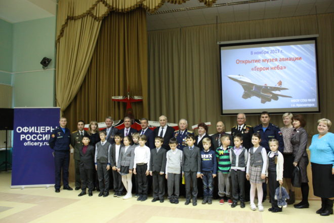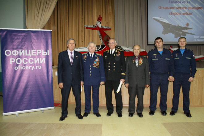 8 ноября члены Президиума «ОФИЦЕРОВ РОССИИ» – председатель Совета отечественных производителей в сфере обороны и безопасности, Герой России, летчик-испытатель 1-го класса Анатолий Кнышов, заместитель председателя Совета патриотических организаций Юрий Чмутин, первый заместитель руководителя исполкома регионального отделения организации в Московской области Виктор Золотухин в качестве почетных гостей приняли участие в открытии музея авиации «Герои неба» в средней школе №18 «Изумрудные холмы» г. Красногорска.