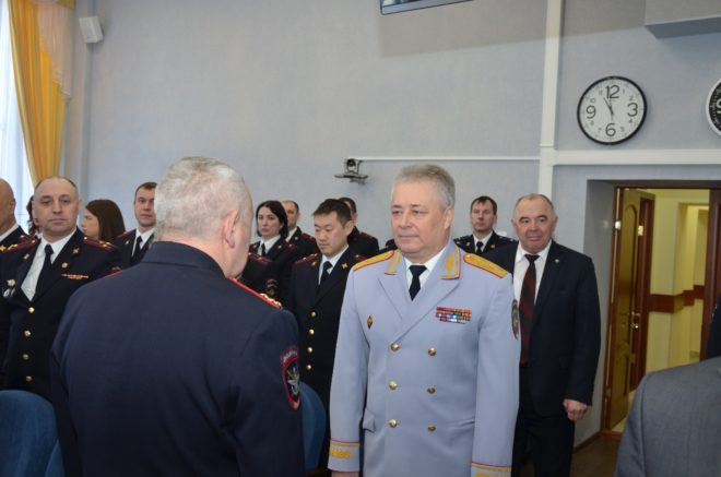 Владимир Палюх поздравил транспортных полицейских с профессиональным праздником, пожелал им здоровья, благополучия, выдержки и смелости в борьбе с преступностью и вручил руководству УТ МВД России по ДФО приветственный адрес.