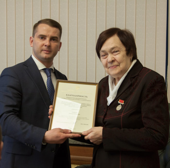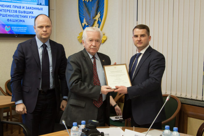 В ходе мероприятия глава Комитета Госдумы по труду, социальной политике и делам ветеранов Ярослав Нилов вручил благодарности активистам Международного союза бывших малолетних узников фашизма.
