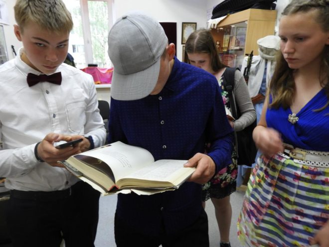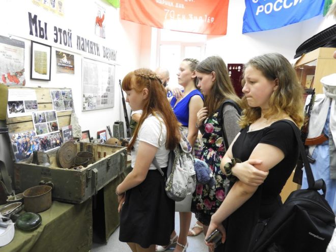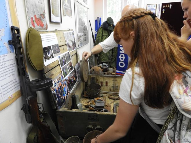 Ребята ознакомились с оружием, фотографиями, письменными экспонатами времен Великой Отечественной войны и документальными материалами о локальных войнах современной истории России. Они также осмотрели книги памяти, где можно было найти своих погибших родственников.