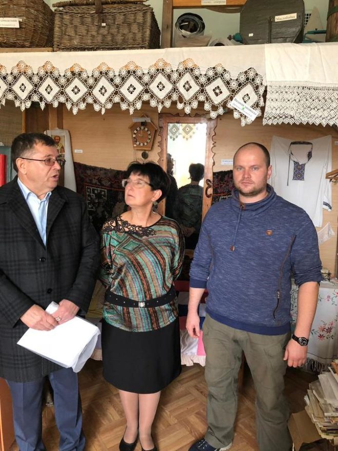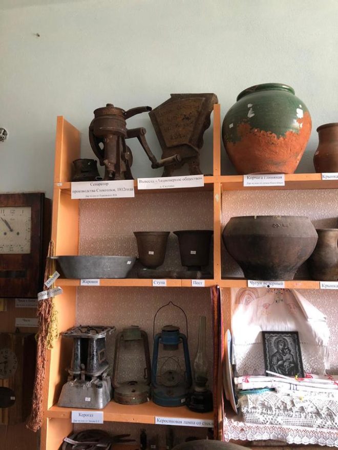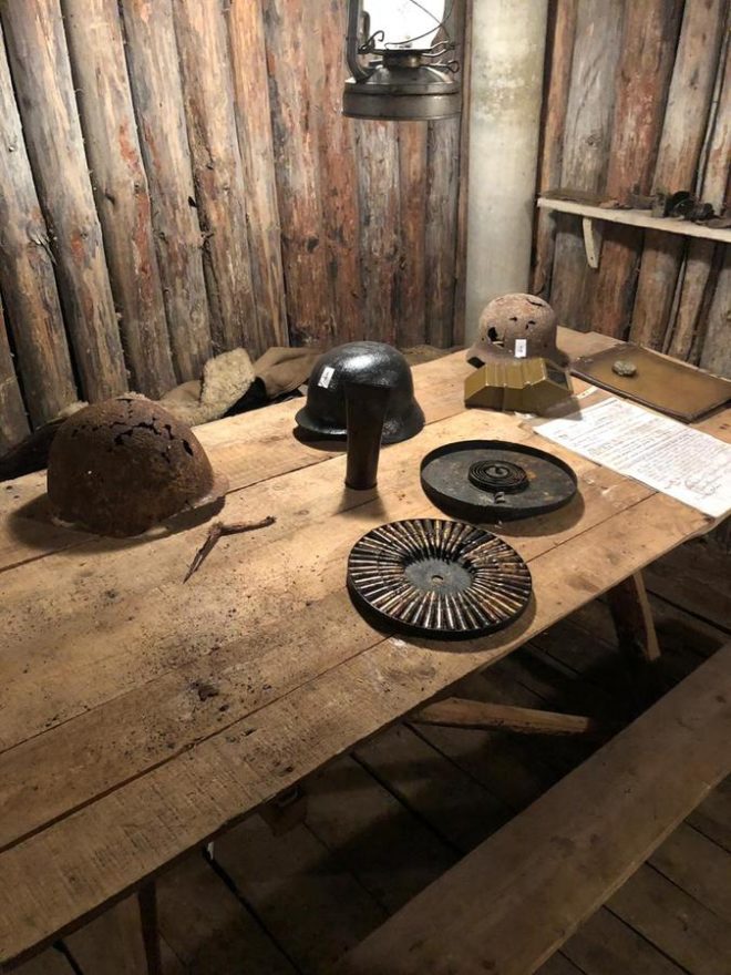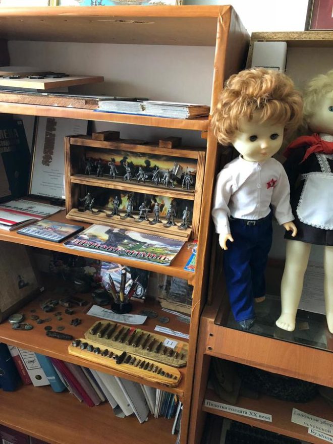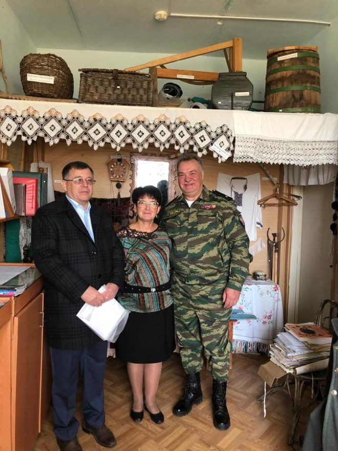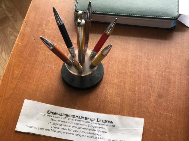 Беседа с учащимися длилась около двух часов, после чего гостей пригласили посетить школьный музей. В одной из экспозиций, которая называется «Блиндаж», школьники и сотрудники музея воссоздали укрытие времен Великой Отечественной войны. На выставке представлены экспонаты, найденные ребятами в поисковых экспедициях, а также личные вещи фронтовиков, переданные в музей ветеранами войны и их родственниками.