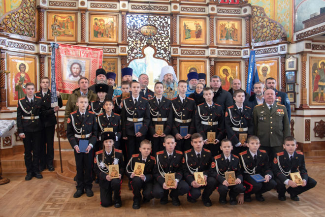 Затем духовник Царев-Алексеевского кадетского корпуса протоиерей Владислав зачитал текст клятвы кадета-казака, который воспитанники повторяли за наставником.
