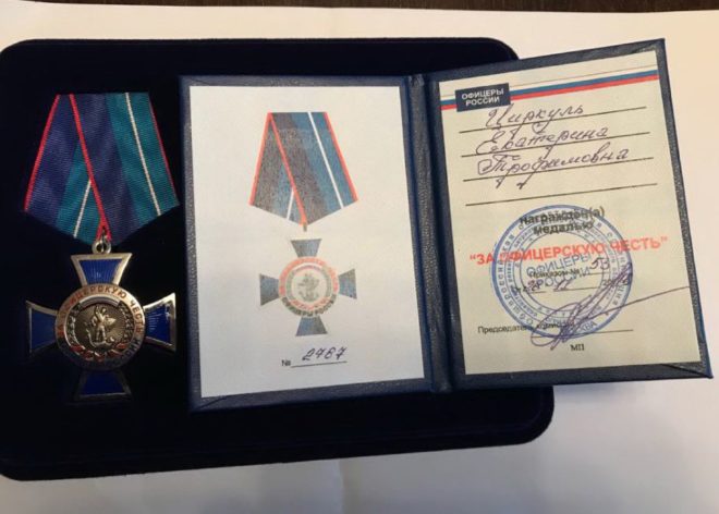 «Общероссийская организация «ОФИЦЕРЫ РОССИИ» наградила медалями «За офицерскую честь» двух фронтовиков – членов Ростовской областной общественной организации ветеранов органов безопасности – Екатерину Трофимовну Циркуль и Николая Александровича Бабушкина. Мне хочется, чтобы, прикрепив награду на грудь, они почувствовали тепло наших сердец и наше глубочайшее уважение», – сказал Николай Ковалев.