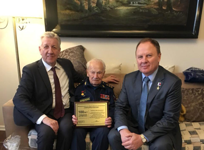 Председатель Президиума «ОФИЦЕРОВ РОССИИ», Герой России, генерал-майор Сергей Липовой и член Президиума организации генерал-майор полиции Владимир Михалевич поздравили героя-фронтовика с вековым юбилеем.
