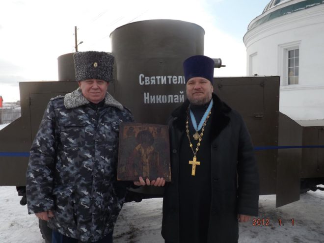 В рамках мероприятия гражданин Таджикистана Сирожиддин Уразов передал председателю президиума регионального отделения «ОФИЦЕРОВ РОССИИ» Сергею Гонюхову старинную икону Святителя Николая Чудотворца.