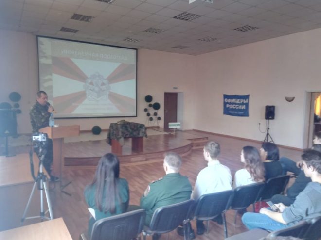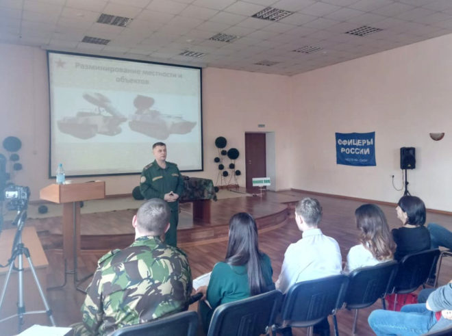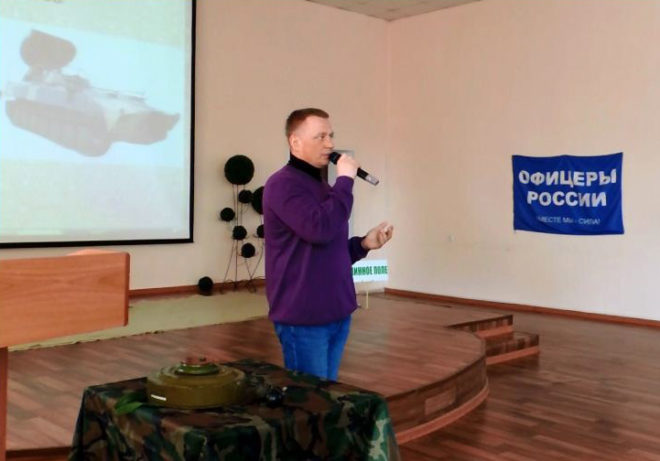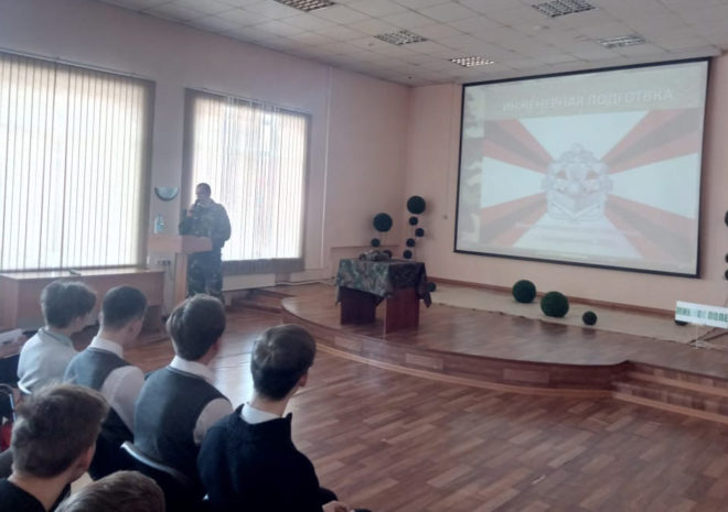 Руководитель исполкома регионального отделения «ОФИЦЕРОВ РОССИИ» в Кемеровской области Владислав Раджабов, активисты местного отделения «ОФИЦЕРОВ РОССИИ» в Междуреченске Александр Перелыгин и Андрей Потапов, председатель Междуреченского отделения организации «Ветераны вооруженных сил РФ» рассказали школьникам об истории возникновения инженерно-саперных войск, их огромном вкладе в Великую Победу, оснащении саперов, видах мин, специфике проведения саперных работ.