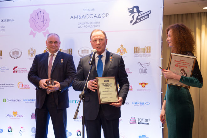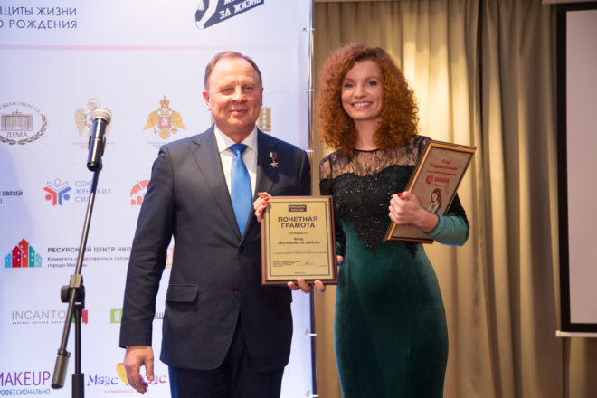 Сергей Липовой вручил генеральному директору Фонда «Женщины за жизнь» Наталье Москвитиной почетную грамоту за популяризацию семейных ценностей и активную работу по укреплению института семьи.