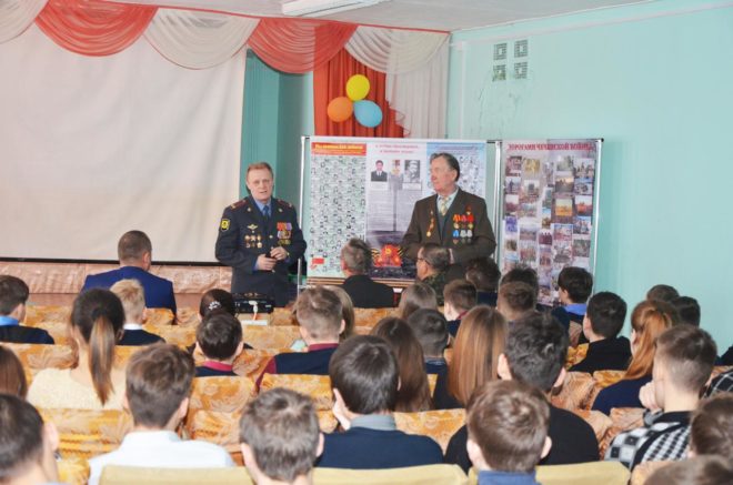 Офицеры показали ребятам документальный фильм об Афганской войне, рассказали о мужестве и героизме солдат, погибших в Афганистане и на Северном Кавказе, военных буднях военнослужащих.