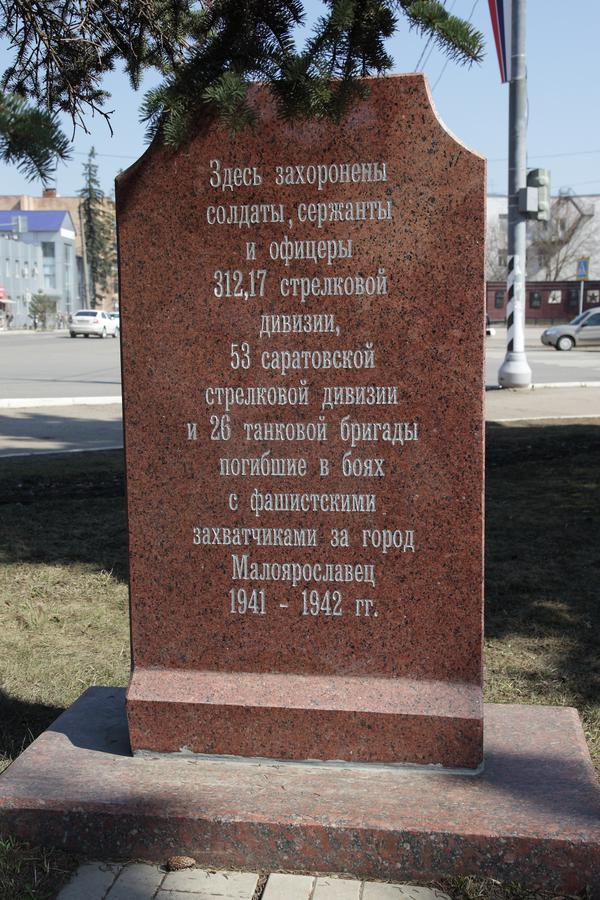 На площади расположены мемориал «Курган славы», памятник узникам фашистских лагерей, аллея памяти воинов-афганцев, памятник герою Малоярославецкого сражения Отечественной войны 1812 года С.И. Беляеву, памятник Маршалу Победы Г.К. Жукову и мемориальный комплекс Героев Советского Союза – участников Великой Отечественной войне 1941-1945 годов.