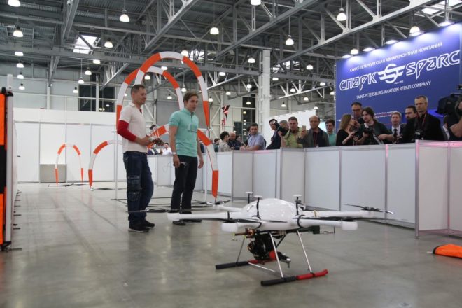 Авторы квадрокоптера-рекордсмена и руководители группы компаний «Съемка с воздуха» – Вячеслав Барбасов и Владимир Тихонов выполнили демонстрационный полет своего беспилотника. Несколько минут полета привлекли внимание почти всех корреспондентов, находившихся в тот момент в павильоне. Провести полноценную демонстрацию возможностей летательного аппарата не позволило закрытое помещение, в котором происходит выставка.