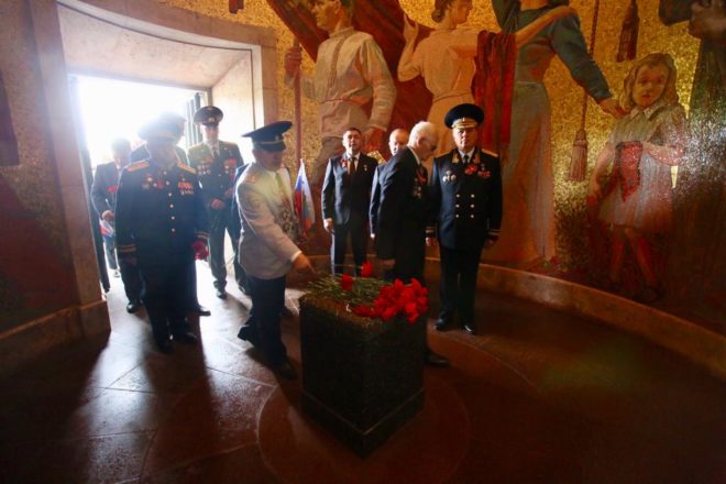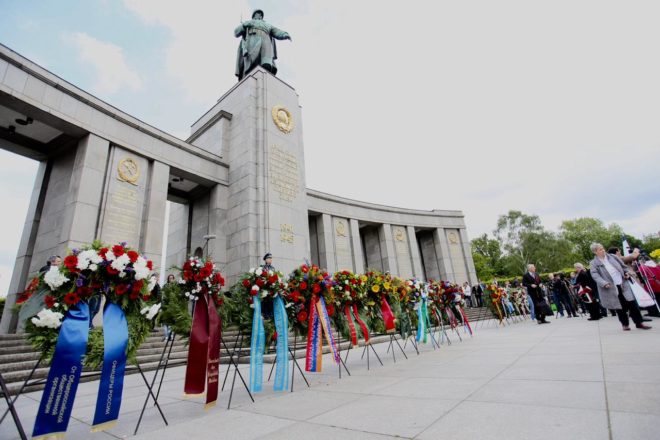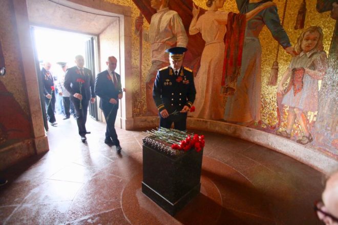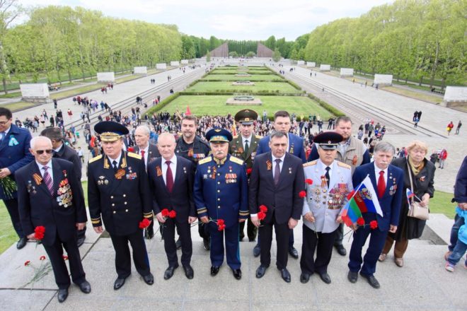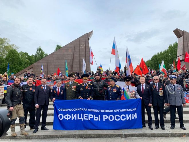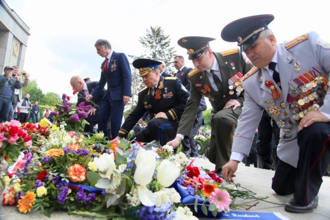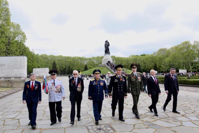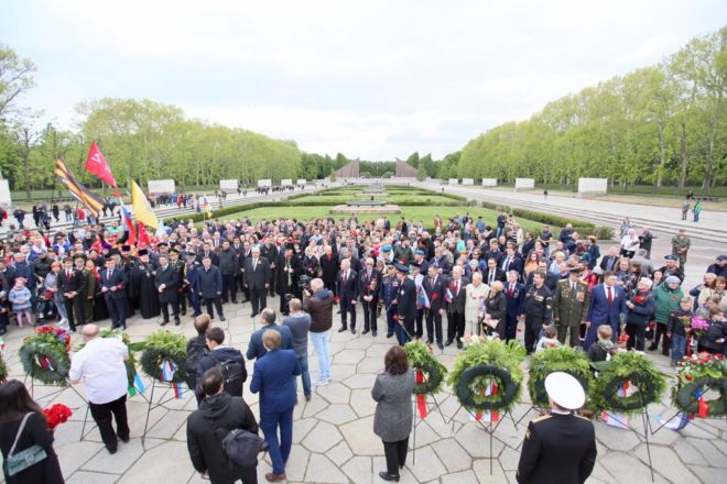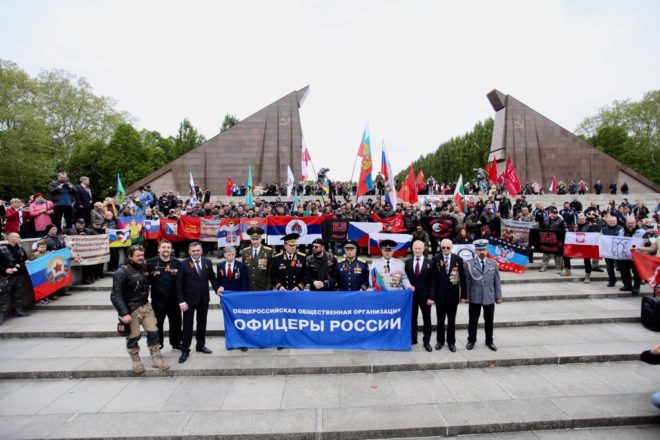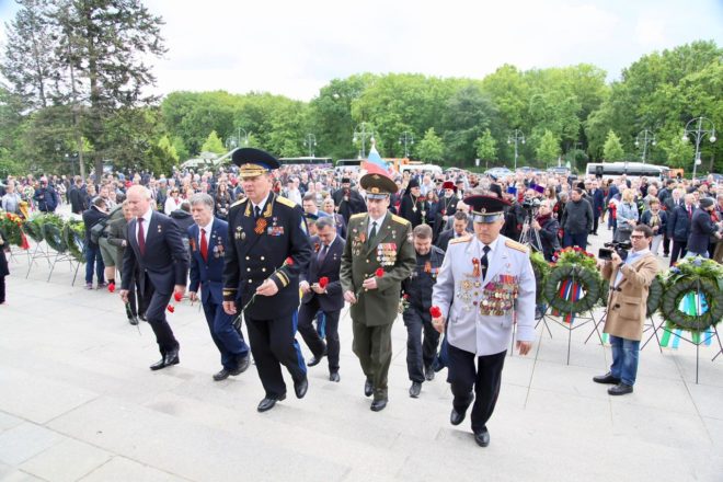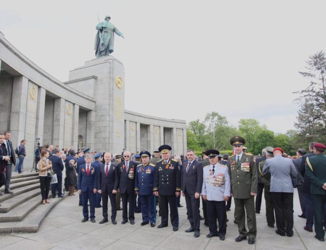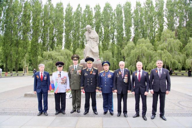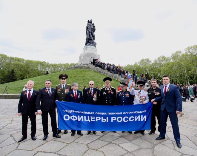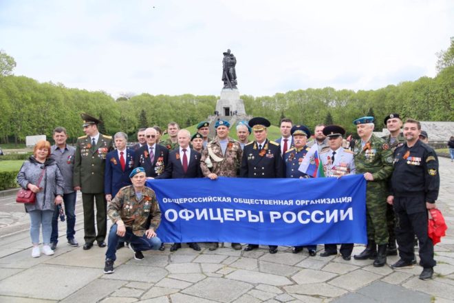 9 мая официальная делегация Общероссийской организации «ОФИЦЕРЫ РОССИИ», в состав которой вошли восемь Героев Советского Союза и России, возложила цветы к памятникам погибшим советским воинам в Трептов-парке и Тиргартене и почтила их память минутой молчания.