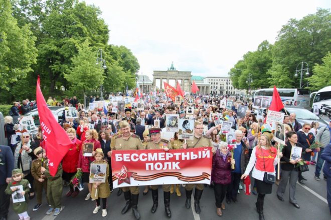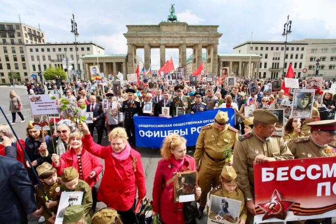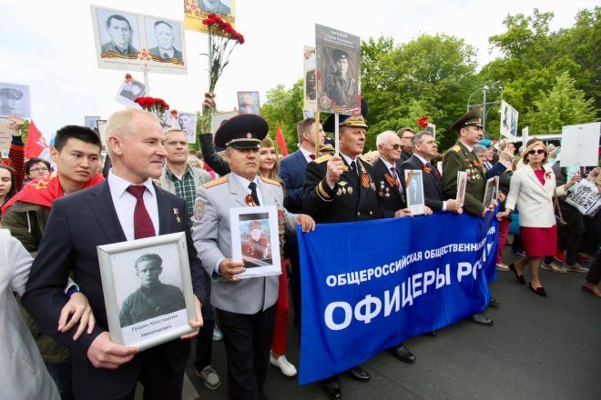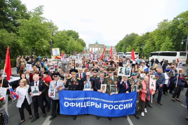 В этот же день делегация Общероссийской организации «ОФИЦЕРЫ РОССИИ» возглавила шествие «Бессмертного полка». Герои Советского Союза и России прошли по улицам Берлина с портретами своих родных, погибших в годы войны.