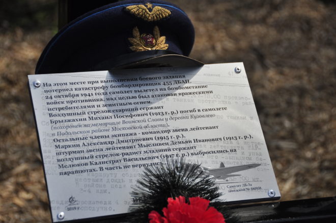 Самолет ДБ-3А 455-го дальнебомбардировочного авиационного полка поисковики обнаружили в 2009 году. В кабине фюзеляжа нашли останки воздушного, стрелка старшего М.И. Брызжахина 1913 года рождения. Имя летчика удалось установить по фрагментам удостоверения личности, найденных на месте падения самолета.