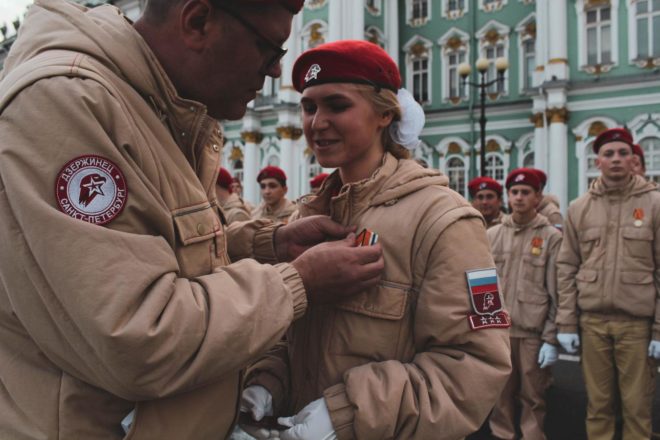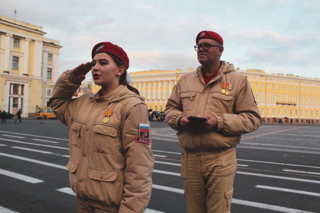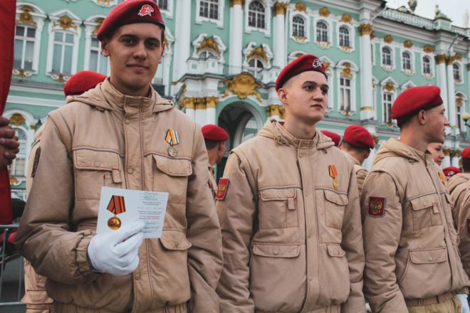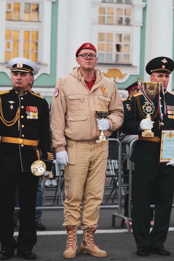 По окончании смотра командир парадного расчета юнармейцев Владимир Кузьмин, член президиума регионального отделения «ОФИЦЕРОВ РОССИИ» в Санкт-Петербурге построил личный состав и вручил удостоверения к медалям участникам праздничного парада в День Победы.