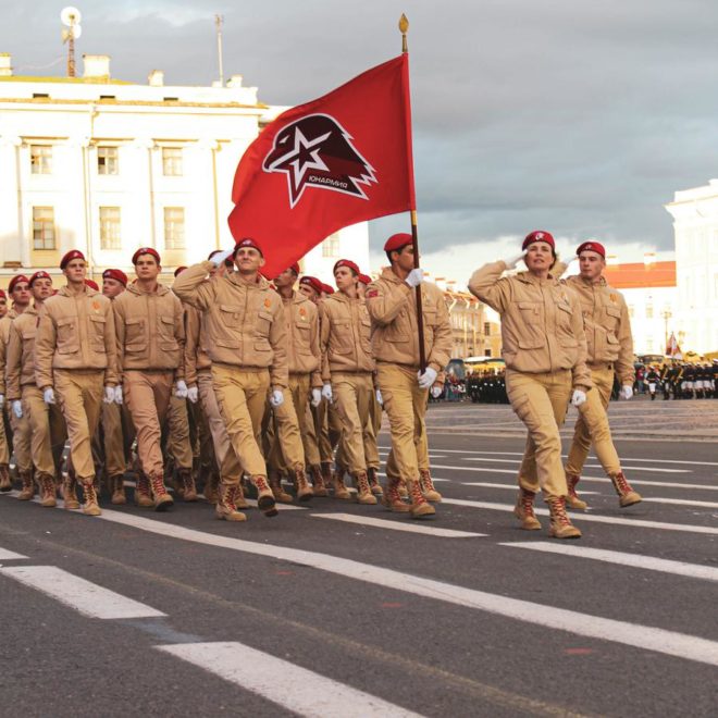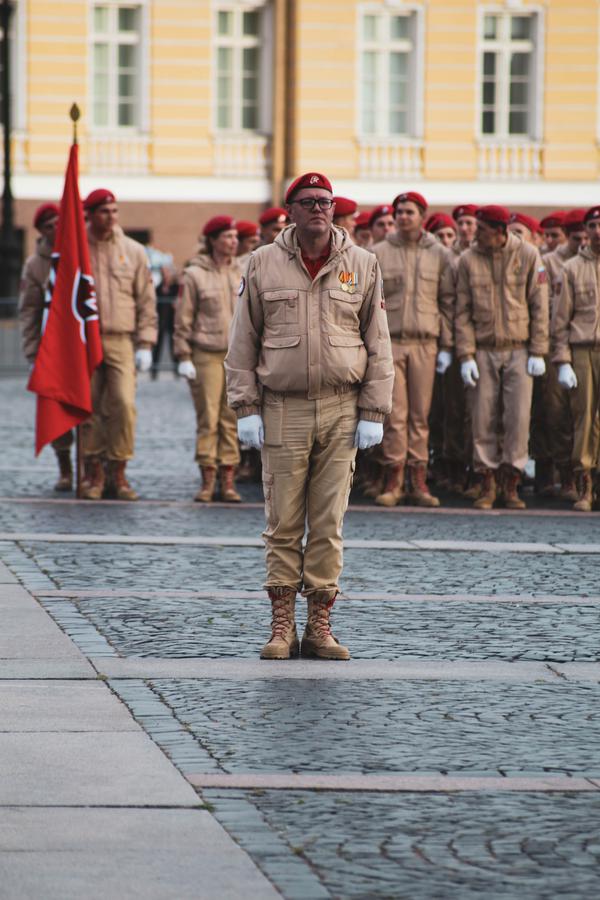 На Дворцовой площади в честь Дня российской гвардии состоялся смотр строя и песни соединений, воинских частей и военных учебных заведений Санкт-Петербургского военного гарнизона, в котором приняли участие более 1,5 тыс. военнослужащих, кадет и юнармейцев.