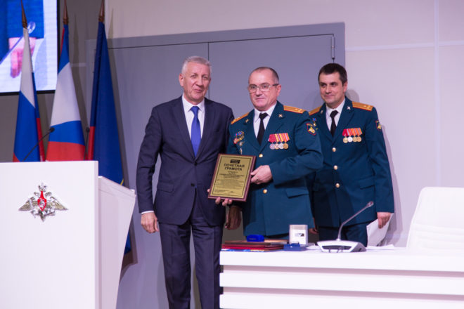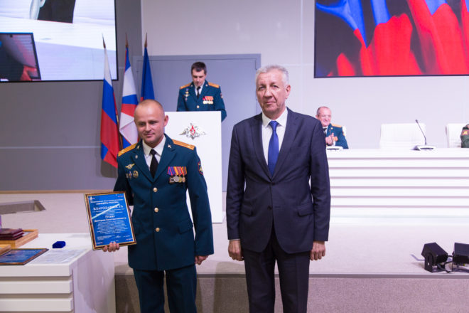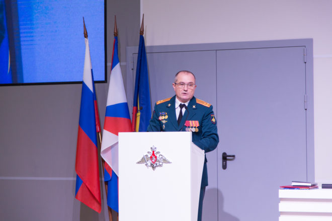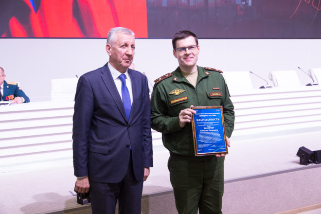 Член Президиума «ОФИЦЕРОВ РОССИИ» вручил медаль «За офицерскую честь» начальнику кафедры, полковнику Александру Чемусову, грамоту коллективу кафедры и благодарности ряду офицеров.