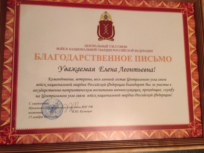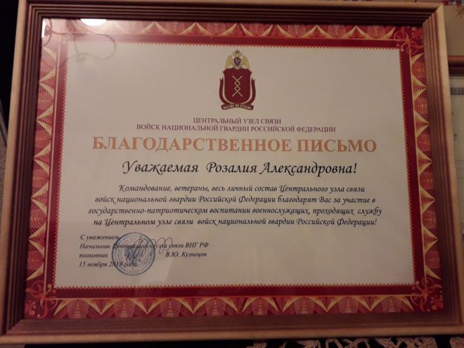 По окончании встречи за активное участие в патриотическом воспитании военнослужащих от командования части Елене Зарембинской и Розалии Абатуровой были вручены благодарственные письма.
