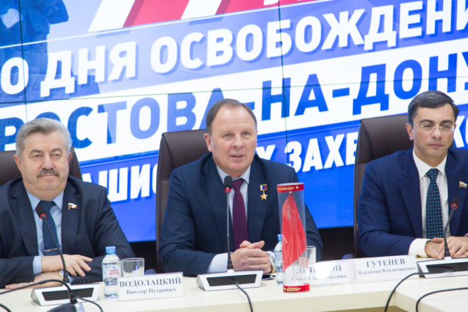 14 февраля в Доме общественных организаций состоялся традиционный телемост «Москва – Ростов-на-Дону», посвященный 77-й годовщине освобождения донской столицы от немецко-фашистских захватчиков. В мероприятии приняли участие председатель Президиума «ОФИЦЕРОВ РОССИИ», Герой России, генерал-майор Сергей Липовой, депутаты Госдумы Владимир Гутенев и Виктор Водолацкий, представители Землячества ростовчан «Донская станица» в Москве.