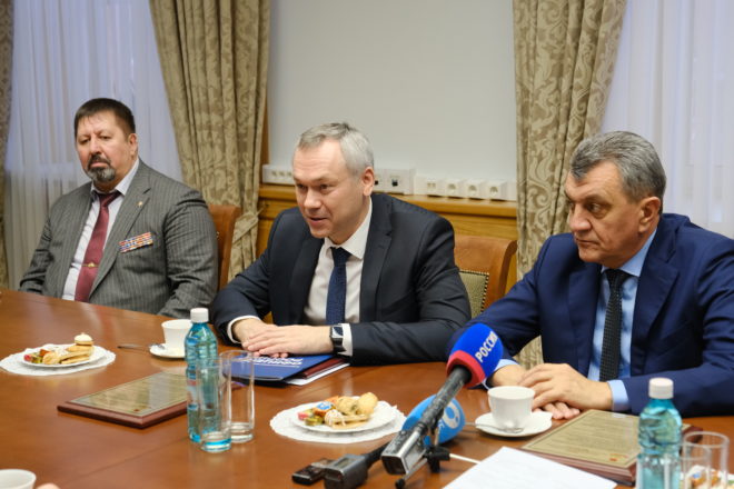 В рамках рабочей поездки в Новосибирск делегация Героев России провела встречу с полномочным представителем Президента РФ в Сибирском федеральном округе Сергеем Меняйло и губернатором Новосибирской области Андреем Травниковым.