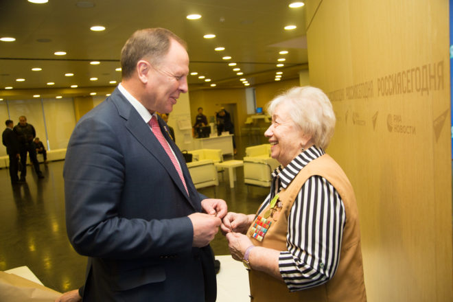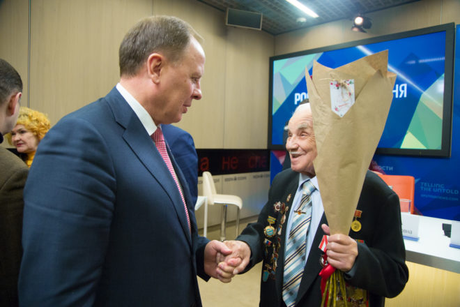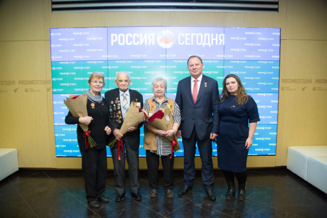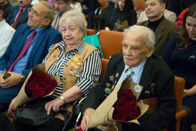 На встрече также присутствовали ветераны Великой Отечественной войны: летчик-штурман, участник Курской битвы, освобождения Белоруссии и Польши Евсей Рудинский; санинструктор в блокадном Ленинграде, участник обороны Ленинграда Раиса Грачева; автоматчик 4-й роты 8-й гвардейской стрелковой дивизии им. И.В. Панфилова, участник освобождения Прибалтики Владимир Бурцев, которых тепло поздравили с наступающей 75-й годовщиной Великой Победы и вручили цветы.