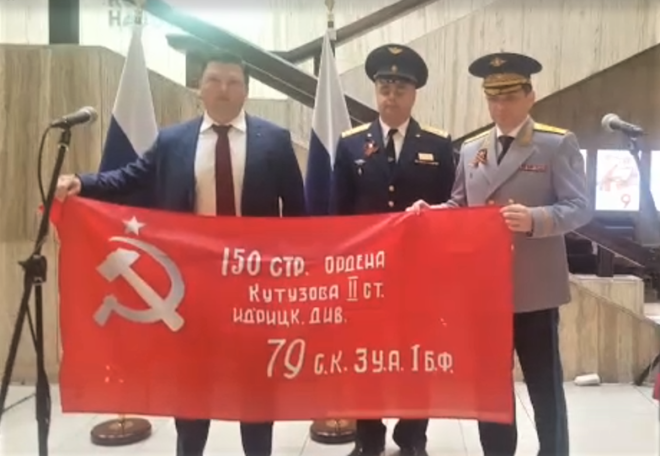 В рамках встречи активист организации «ОФИЦЕРЫ РОССИИ», внук Героя Советского Союза, генерала армии Николая Лященко – Олег Еременко передал на постоянное хранение копии Знамени Победы российским военным атташе, а также директору Российского дома науки и культуры Павлу Извольскому.